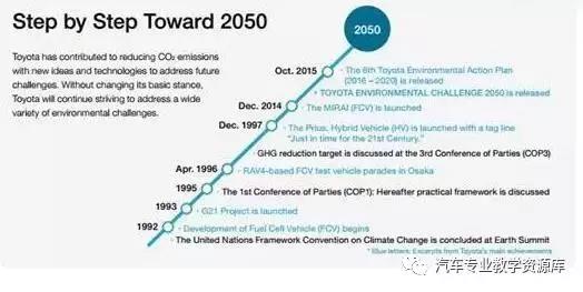 2015年,豐田發(fā)布了環(huán)境挑戰(zhàn)2050全球戰(zhàn)略,主要是面向未來的、以汽車企業(yè)為中心,立足整個(gè)行業(yè)乃至整體社會(huì)生活形態(tài)的環(huán)境發(fā)展計(jì)劃。這份規(guī)劃提出了有關(guān)未來環(huán)境事業(yè)的六個(gè)挑戰(zhàn):分別是汽車CO2尾氣零排放、汽車生產(chǎn)周期CO2零排放、工廠生產(chǎn)零排放,對水環(huán)境的影響最小化、構(gòu)建可循環(huán)的社會(huì)體系、建立和諧自然的未來社會(huì)。為完成這六項(xiàng)調(diào)整,豐田主要通過進(jìn)一步推廣混合動(dòng)力技術(shù)插電式混合動(dòng)力技術(shù)以及推廣零排放的燃料電池汽車。豐田公司于2014年底正式開始銷售燃料電池,根據(jù)各個(gè)國家和市場基礎(chǔ)設(shè)施的建設(shè)。而在這份環(huán)境戰(zhàn)略中,豐田也系統(tǒng)回顧了自己歷年來在新能源產(chǎn)品方面的投入和成就,主要是FCV和HEV,但在EV方面的嘗試幾乎一筆帶過。此外,豐田公司面對EV已經(jīng)專門成立了一個(gè)新的部門。