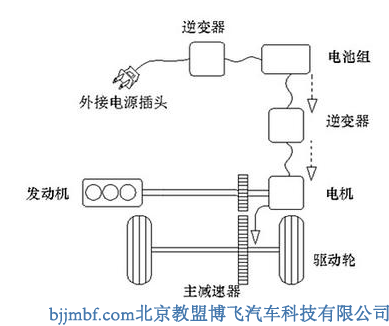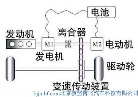 比亞迪F3DM沒有動(dòng)力分配機(jī)構(gòu),只有簡單的幾個(gè)離合器,兩個(gè)電機(jī)和1.0升的發(fā)動(dòng)機(jī)在一個(gè)軸上。這個(gè)軸通過減速器直接驅(qū)動(dòng)車輪。
