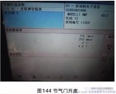 發(fā)動機怠速運轉時查看數據流,節(jié)氣門開度和點火提前角都正常(圖144)。