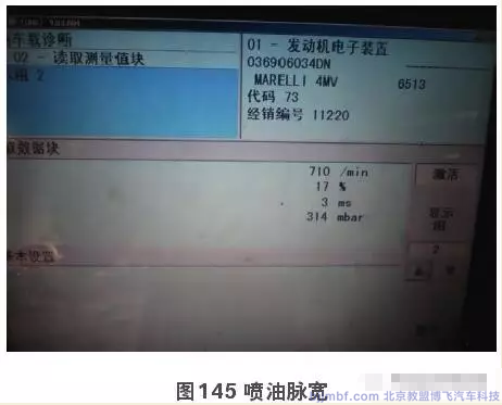 但是從第2組數據看(圖145),相對于31.4 k Pa的進氣氣壓而言,噴油脈寬略微偏高,說明進氣測量有可能存在誤差。逐一堵住節(jié)氣門后的通氣管路,同時觀察噴油脈寬的變化。