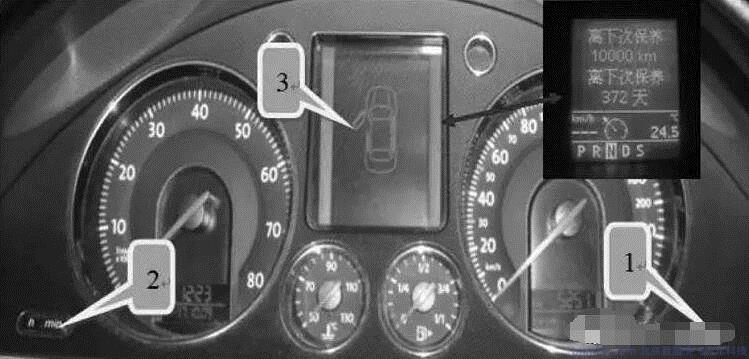 (3)按一下按鈕2,復(fù)位完畢。復(fù)位完畢之后可以通過手動操作儀表上的1按鈕,檢查距離下次保養(yǎng)的間隔里程和間隔時間。