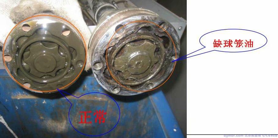 5.進(jìn)一步確認(rèn)后,將左半軸拆下,進(jìn)行仔細(xì)檢查,對(duì)其半軸進(jìn)行晃動(dòng)聽(tīng)到內(nèi)球籠有異響,像是缺少球籠油而引起的。對(duì)其內(nèi)球籠上蓋進(jìn)行拆卸,發(fā)現(xiàn)內(nèi)球籠球嚴(yán)重缺乏潤(rùn)滑脂。故障點(diǎn)找到。