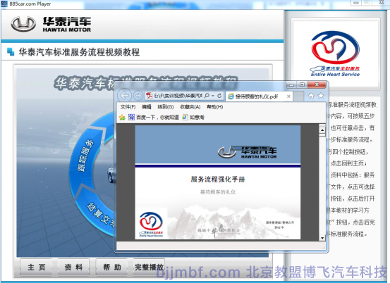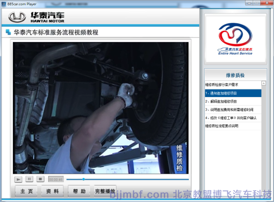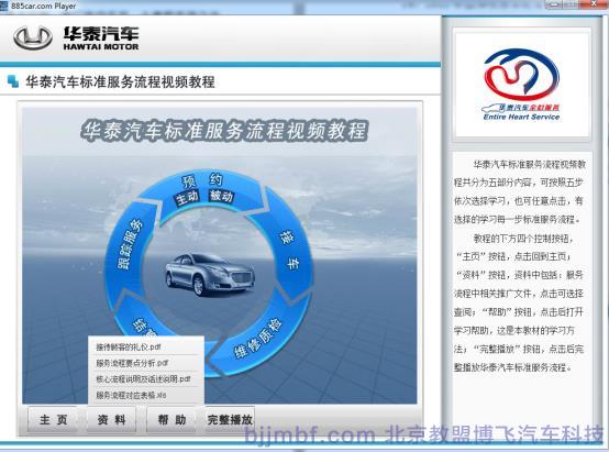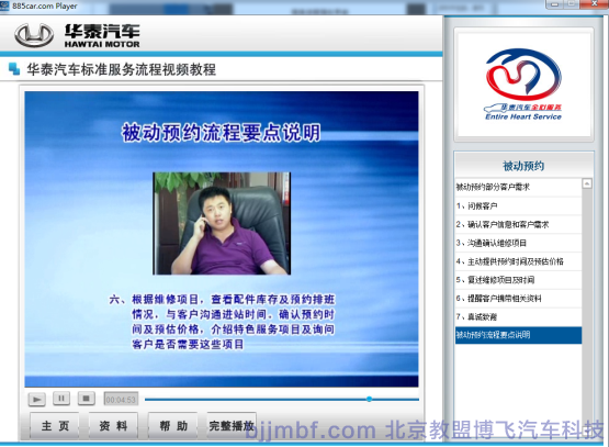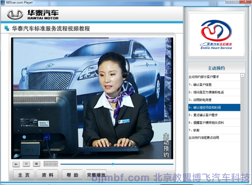 《汽車標(biāo)準(zhǔn)服務(wù)流程視頻教程》全景視頻教學(xué)系統(tǒng)結(jié)合廠家標(biāo)準(zhǔn)服務(wù)規(guī)范流程,標(biāo)準(zhǔn)化操作完成預(yù)約客戶、接車、維修質(zhì)檢、結(jié)算交車跟蹤服務(wù)等一系列完整售后服務(wù)流程;教學(xué)系統(tǒng)運用平面、視頻、多維動畫技術(shù)形成一套集講授、實景演示、重點回顧、原廠服務(wù)商務(wù)標(biāo)準(zhǔn)等立體視頻教學(xué)系統(tǒng);完整詳細的汽車服務(wù)過程中標(biāo)準(zhǔn)流程,服務(wù)禮儀、標(biāo)準(zhǔn)話術(shù)、各種細節(jié)及服務(wù)技巧;彌補傳統(tǒng)視頻畫面單一,重點不突出,標(biāo)準(zhǔn)規(guī)范不明顯等缺點;立體視頻教學(xué)系統(tǒng)同時具備一定的自動考核、教學(xué)環(huán)境識別等功能,從而提高學(xué)習(xí)和訓(xùn)練效率。